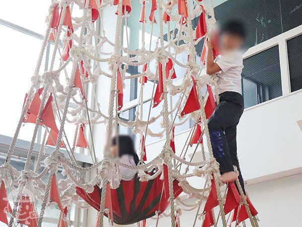 ロープジャングル&ボールプール 高さ8mのロープのジャングルジムがあるよ!一番上までのぼれるかな~?下は、カラーボールがたくさん入ったボールプールになっています。