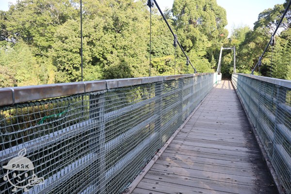 駐車場からつり橋を渡って「森の宝島」へ向かいます(つり橋を渡らずに行ける道もあります)。